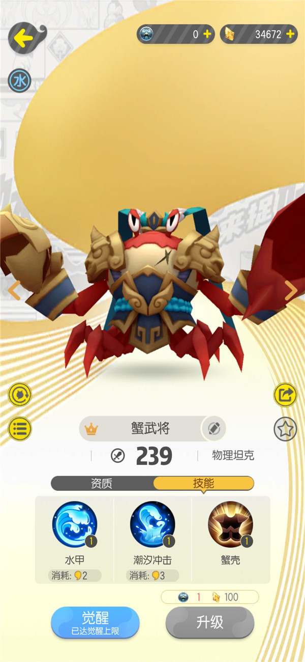 蟹武将,输出为水,被土和风克制,克制火和煞属性妖灵,护盾技能和巨灵神一样可以保护队友,自身的物理坦度足够,缺点就是妖灵比较难获得。