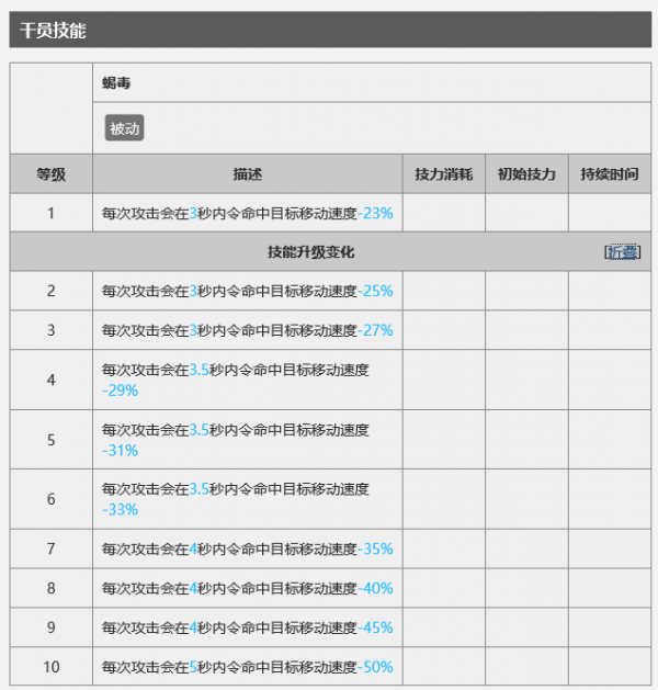 1技能为平a附带减速,与减速辅助不同,狮蝎减速就是减移速,就算出了狮蝎攻击范围,也会减速到持续时间结束。减速辅助干员攻击间隔为1.9s,效果为停顿0.5s,相当于常态减速26% 当然真理安杰需要减速的时候开技能效果就远远超过了 ,而狮蝎7级技能为35%,如果一进入狮蝎攻击范围就减速的话,在攻击范围内能为高台多提供53%的输出时间。以sk5为例,可以使得狮蝎攻击范围与输出重叠。也可以直接放在重装面前,延缓重装接敌的时间,让高台先白嫖一会近战敌人。一般我在高台位充足不需要狮蝎补输出的情况下携带1技能,来为高台创造更好的输出环境。减速只有在10级后达到5秒,8-10为每级增加百分之5减速,个人觉得性价比不高。