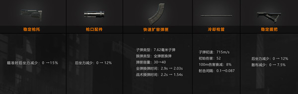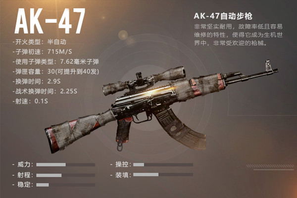 AK-47使用7.62mm子弹,初始射速715M/S,弹夹容量30发(可扩容至40发),可装配配件枪托、枪口、扩容弹夹、冷却枪簧以及握把来提升作战能力,因故障率低、结实耐用而广受好评。