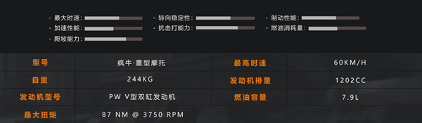 疯牛重型摩托,采用PW V型双缸发动机,自重244KG,最高时速可达60KM/H,抗打击能力与爬坡能力均十分优异。