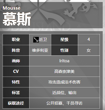 慕斯的属性和其他的挡1近卫比起来更加均衡,攻击力稍低而防御更高,而且有魔抗,使得慕斯自身的血的质量比较高,虽然输出没有那么暴力但是因为是魔法伤害,所以相对稳定。