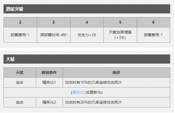 慕斯的天赋,连击,其实是个不错的输出提升的技能,精1的时候约等于总倍率提升10%,精二和潜能同理,最高提升23%的平均输出倍率。视觉上表现是迅速的二连爪击,第二次攻击并不会积累1技能的技力,且吃不到挠伤的加攻是美中不足。