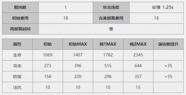 攻击速度这里看到虽然标着较慢,但其实和同样较慢的玫兰沙,芙兰卡,缠丸(都是1.5),银灰(1.3)相比要快一些,而较高的攻速给了1技能精3之后很高的覆盖率,使得慕斯的实用性大大增加。