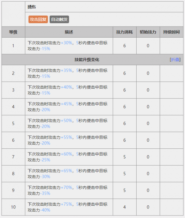 推荐点到7级,7级算是一个小质变,减攻25%,技力消耗5,也就是6次平A,7.5s,一个循环,持续5秒,覆盖率67%。