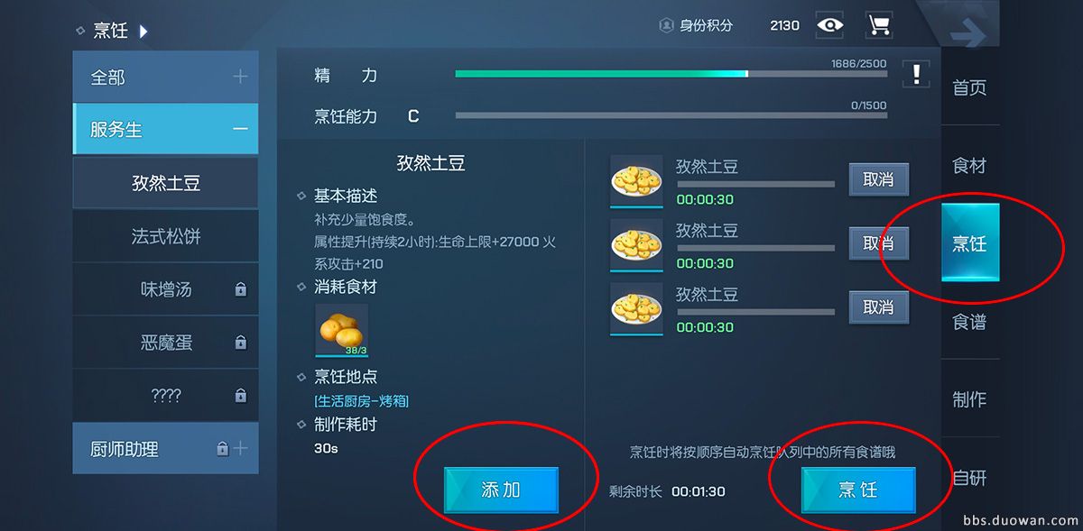 点击【烹饪】页面。选择所需的物品,并添加材料。然后就可以愉快的开始烹饪食物了。