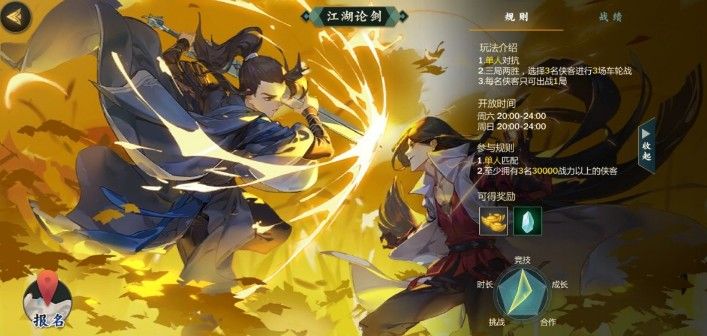 如果你是喜欢PVP战斗的玩家,还可以在“江湖论剑”模式中进行单人对抗,而且参与该模式的玩家至少要有3名3万以上战力的侠客。至于阵营战与名剑大会,同样也是与路人进行匹配,可以让你在这个虚拟江湖中结识到更多的朋友。当然,你也可以选择和亲友在3V3模式中一同上阵,对抗强敌。