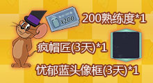 签到7天:忧郁蓝头像框(3天)*1、疯帽匠(3天)*1、200熟练度*1