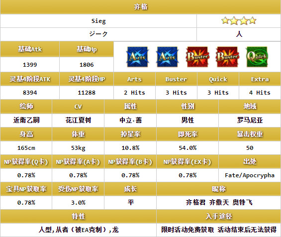 作为FA活动赠送的奖励从者,齐格的亮点在其宝具的NP回收能力。群体共12Hits的蓝宝具虽然使得齐格NP获取率略微被影响但削弱幅度并不大,在一技能NP率Buff和二技能蓝卡性能的增幅下,满级技能的齐格仅靠自身Buff就能通过宝具回收超过60%的NP,若再搭配NP或蓝魔放辅助,加上三技能的自充,齐格甚至有能力多次连放宝具。宝具附带攻击前降防的副效果,宝具连发的话能对全队带来不低的伤害辅助。