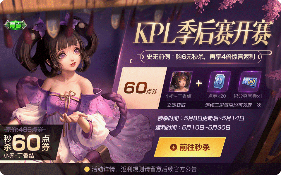 恋爱和战斗都要勇往直前!为了庆祝季后赛热血开赛,王者荣耀小乔新皮肤“丁香结”史无前例超大折扣来啦~秒杀价不要488,不要288,只要60点券丁香结抱回家!而且购买丁香结不仅可以享受60点券秒杀,在之后你还可以获得4倍惊喜返利!拥有小乔-丁香结并且在活动期间连续三周每周登录游戏可领取总共点券*60+积分夺宝抵用券*3的返利,是不是超级心动呢?