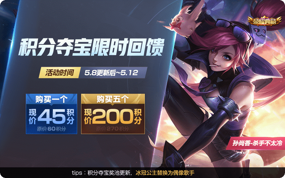 喜迎季后赛福利大放送,积分夺宝限时回馈自然也是少不了哒~5月8日更新后-5月12日期间,各位小伙伴们就可享受荣耀积分折扣购买,同时夺宝奖池也会更新~原价一个60积分,现价只要45积分,而五连抽只要200积分,真的超级棒有木有?你做好准备了没?