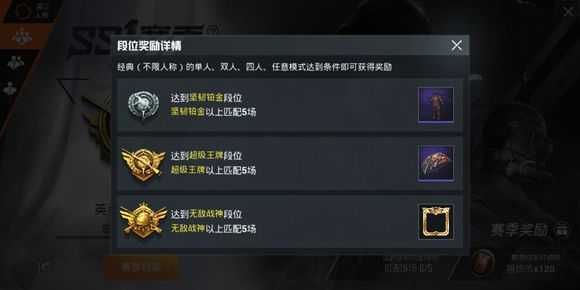 《和平精英》开启SS1赛季,选手们可通过参与竞赛提升段位,达到特定段位的选手可获得特训套装、王牌降落伞、战神头像框等段位奖励。