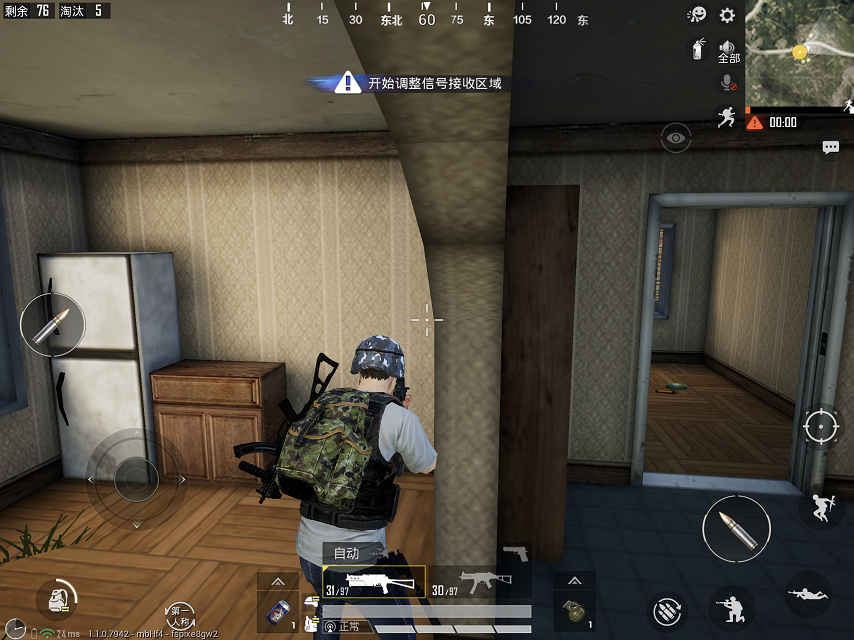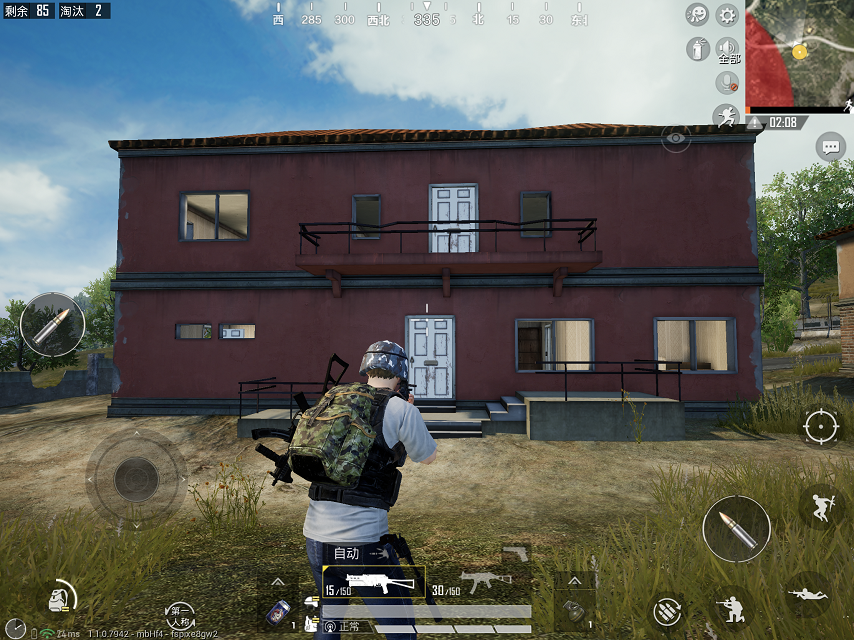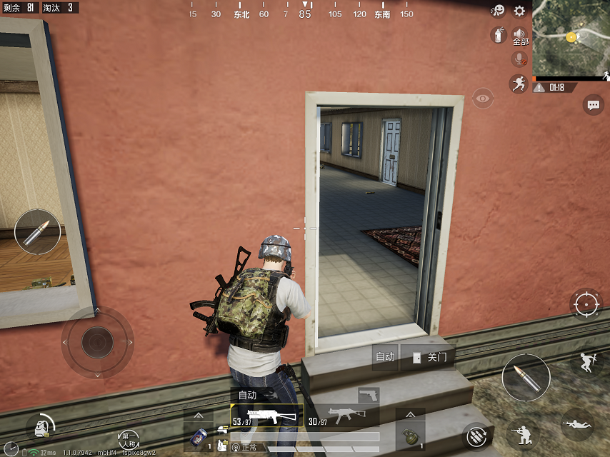 相信大家都知道,在第三人称模式下,可以通过移动地图左下角的自由镜头按键(小眼睛),在身体不用动的情况下,就可以观察自身周边的视野,灵活运用这一点对于进攻多层楼十分重要。首先环绕房子一周通过窗户、门口等地方获取基本的视野,确认安全后进入。在通过有视野死角的地方时,先靠近墙体,移动小眼睛来多获取一点视野,如果确认周围可视环境安全,那么对手一定在墙边死角蹲守,所以我们在通过墙体的第一时间就把枪口对准视野的死角并开枪,那么正在死角处蹲守的对手就无处可逃了。