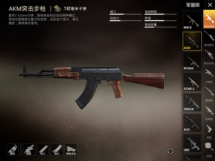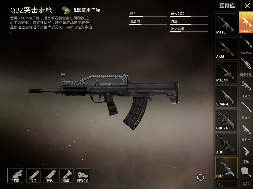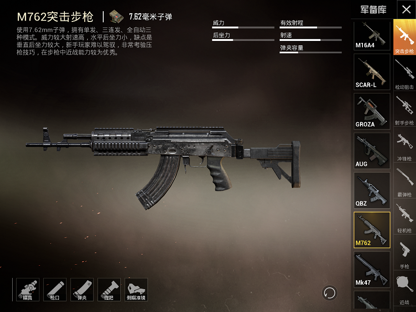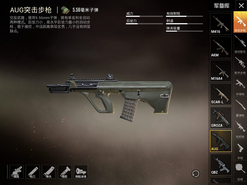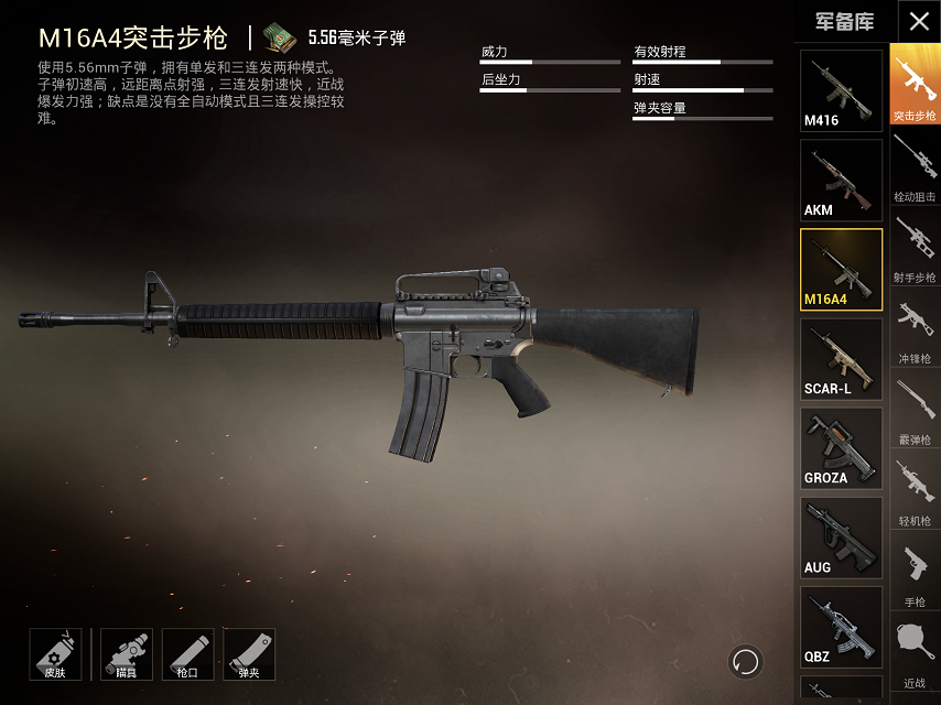 与此同时,武器的选择也尤为重要,后坐力越小的武器压枪实现会越简单,这里推荐上诉提到的5.56毫米子弹突击步枪,枪械基础后坐力小,并且配上减少后坐力的枪口,握把能进一步减小压枪难度。最突出的武器是满配的M416突击步枪,除了枪口和握把,还拥有最重要的枪托进一步减少后坐力。而使用7.62毫米子弹的突击步枪,上手难度较大,不推荐使用。