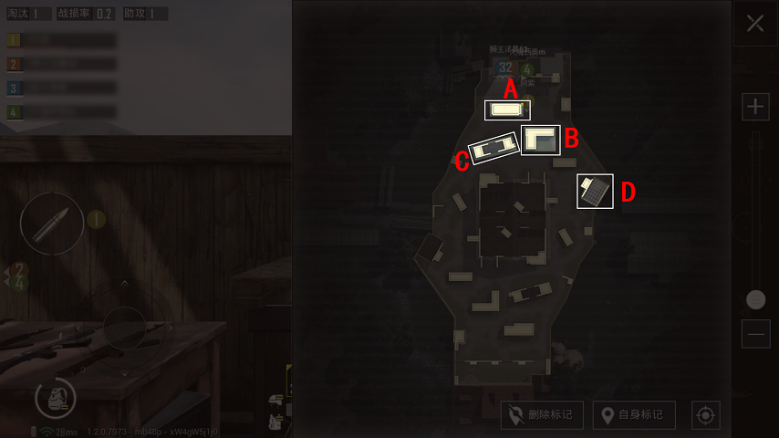 如果在进攻的过程中,健康值受损,建议躲到建筑物C,此处能够躲避对手的后方攻击,隐藏的空间让对手发现不了自己,有利于健康值的回复。其实游戏是可以进入到对方的初始点,但不建议玩家这样做,因为对手返场会有3秒无敌时间,进去对放的初始地点无疑是投怀送抱。建议躲在建筑物D里观察情况,待对方的无敌时间过后,伺机淘汰对手。