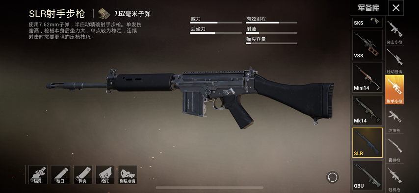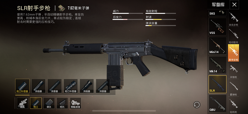 因为SLR是射手步枪,所以能使用的配件比较多,借助配件的优势可以将它的劣势弥补回来。