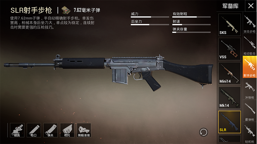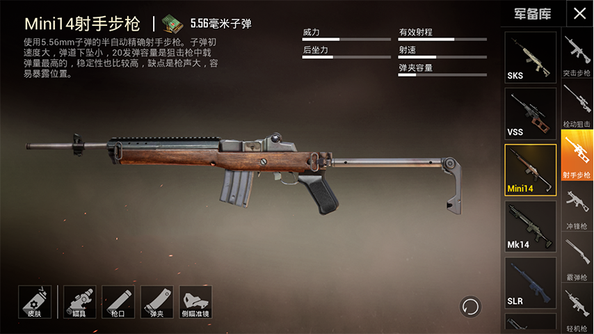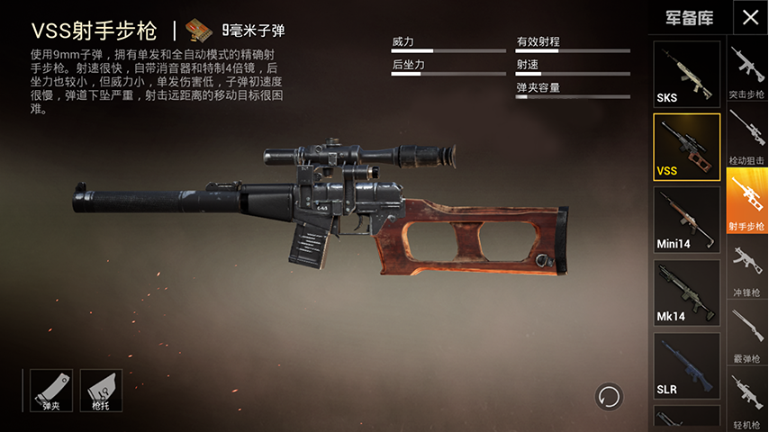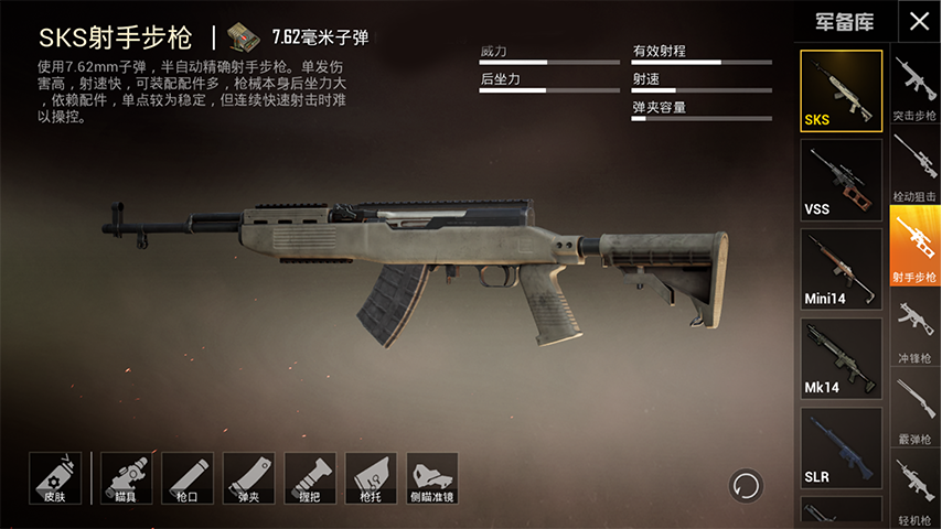 目前,游戏一共给玩家提供了六把射手步枪进行使用,分别是SKS、VSS、Mini14、SLR、MK14和QBU。射手步枪所使用的弹药口径包含了9mm、7.62mm和5.56mm三种,具有半自动或全自动两种射击模式。在这其中,SKS和SLR是射手步枪的代表。VSS射手步枪由于本身的属性局限,属于冷门的射手步枪;MK14射手步枪属于空投武器,玩家使用几率不高。QBU射手步枪则是雨林地图中独有的武器。