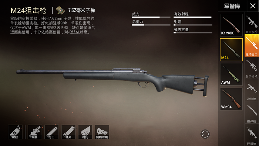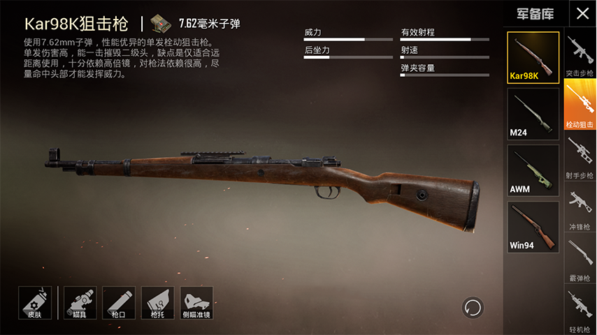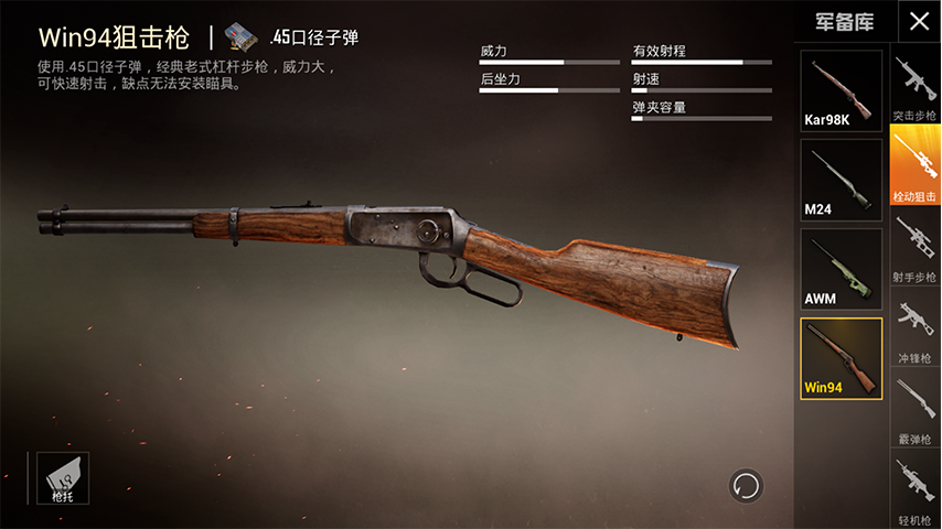 栓动狙击枪械在游戏中一共有四把,分别是Kar98K、M24、AWM和Win94。在这其中,Win94由于伤害(相对于其它栓动狙击枪械而言)不足和没有办法装配瞄镜的缘故,仅限于游戏初期刚枪或者物资匮乏的时候,玩家会选择使用。大部分情况下,Win94不会陪伴玩家走进“决赛圈”。AWM在暴击下可以做到无视任何防具达到一击淘汰的效果,但是由于其属于空投武器和稀少的使用专属马格南子弹,基本上玩家使用的几率较少。Kar98K和M24是玩家最常使用的栓动狙击,都可以对装备“二级头盔”(包含)以下头部护具的满状态玩家进行一击淘汰。从某种意义上来讲,M24是相当于加强了的Kar98K。