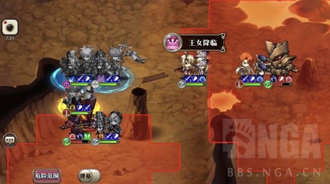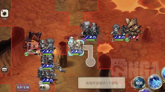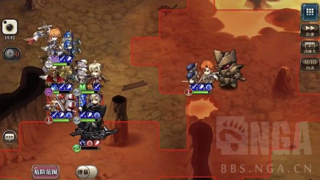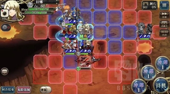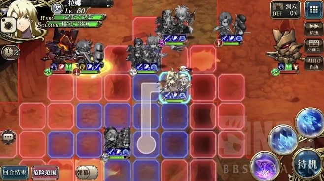 2回合,艾尔文往右走一步卡住敌人位置,雷丁A熔岩巨人,离开危险范围,露娜打一下熔岩巨人再移动到艾尔文左边(下回合给岩石巨人增伤)。