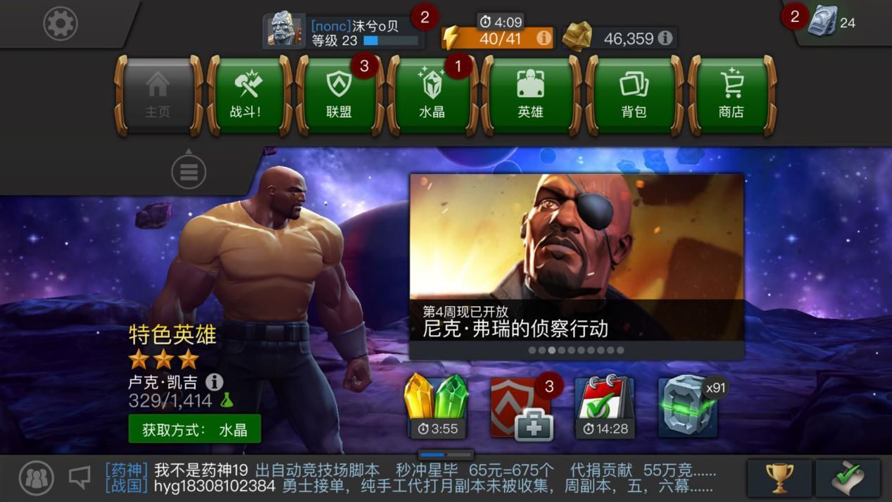 联盟是玩家之间交互的地方,同时在联盟中你也会和其它敌对联盟交战。当你第一次进入联盟后就能获取到免费抽英雄的机会,简单点说加入联盟之后系统会送一个高级英雄水晶,这可能就是联盟对新成员的一种欢迎仪式吧。当然联盟平日里还会有独特的副本供玩家体验,这些副本都是有材料、英雄的掉落,加入一个相对活跃的联盟是每一个《漫威:超级争霸战》玩家的第一步。
