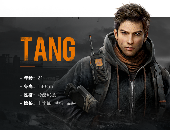 唐是一名擅长在城市中搜索物资,使用十字弩进行捕猎和自卫的生存专家,拥有极强的追踪、潜行能力。虽然年纪小,却是资深的拾荒者,也是城市废墟中让黑帮暴徒又恨又怕的“暗夜猎人”。在灾变后的世界中,他的这种能力被环境放大,成为了营地小队中最值得依赖和倚重的角色之一。