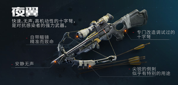而在所有冷兵器中,十字弩是完全消音,却对感染者和人类都有克制作用的武器。使用十字弩的人,都拥有一颗冷静沉着的心,以及迅速的判断力,能在间不容发的时间里射出弩箭,一箭克敌。