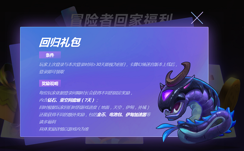 回归系统开启后,满足条件的回归玩家登录游戏即可领取回归礼包,礼包内含钻石、亚空间魔蜥(7天)等固定奖励;同时根据大家回归时的游戏进度(地面,天空,伊甸,外域)还能获得不同的额外奖励,包括金币、电池包、伊甸加速道具等诸多福利