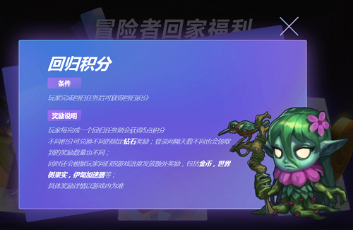 玩家完成回归任务后可获得回归积分,不同积分可兑换不同的固定钻石奖励;同时还会根据玩家回归的游戏进度发放额外奖励,包括金币,世界树果实,伊甸加速道具等;
