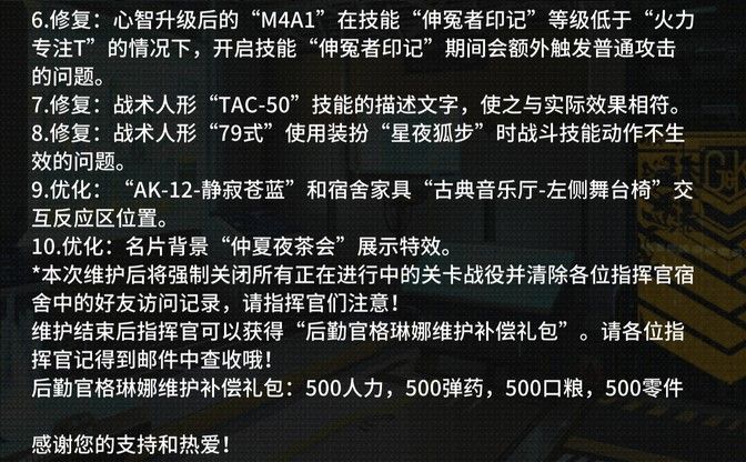 *本次维护后将强制关闭所有正在进行中的关卡战役并清除各位指挥官宿舍中的好友访问记录,请指挥官们注意!