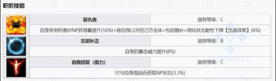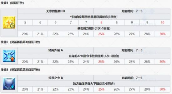 二技能,30%的数值算一个幅度偏低的蓝魔放,但是这里的3次/5回合尤其尴尬这意味着如果你想玩连发、想让这个蓝魔放覆盖三个宝具,那么就不能在宝具后出蓝卡补刀,否则就会提前消耗掉蓝魔放。如果你拿他打一发……那跟一回合有什么区别?反而被这个拖累了幅度……