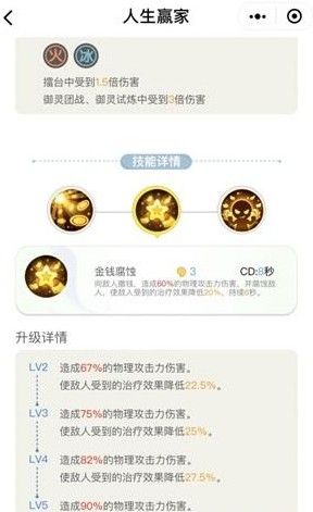 人生赢家是需要四只妖灵合体觉醒,分别是:杠精、求生欲、背锅侠和佛系妖。光听这些名字就不是一般的奇葩,接下来小编再给大家介绍一下人生赢家的技能。一技能金钱诱惑:用金钱向敌人喷吐四次,每次造成22%的物理伤害。二技能为所欲为:让场上所有妖灵免疫控制三秒。被动赢在起跑线,在开场时给自身场上所有妖灵提供一个护盾,相当于自身血量的16%。