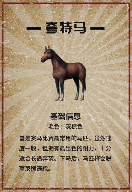 专属马匹,另外,当幸存者在势力阵营,获得更多的战勋,达到对应的职位,护卫队职位达到“赏金猎人”强袭帮职位达到“狂轰乱炸”还可以解锁专属马匹哦。