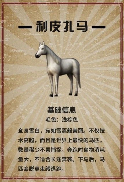 还有一种是“利皮扎马”,这种马全身雪白,速度比上面两种马都要快,但是其数量稀少,想要遇到它,就需要一点运气了。