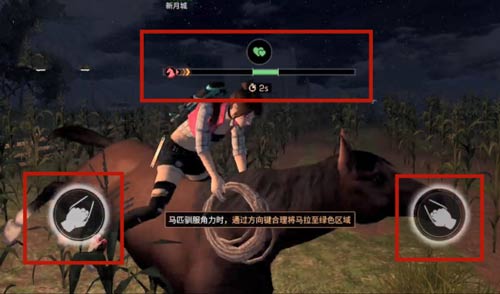 不过套马可不是一个简单的活,下面来教教大家套马:在拿着做好的套马索,我们尾随一直看上的小马驹追着它,然后就趁小马不注意的时候甩出套马索!骑上马背之后,可以看见屏幕左右两边都出现了手握缰绳的图标,长按左右图标调整上方马头的位置,将马头停留在绿色区域内,多试几次当上方绿色心型圆圈圆满之时,就训马成功了。同时小马也可以加速哦!