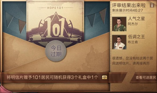 活动期间每天0点到22:55可以免费另一个明信片,也可以在商队集市中兑换明信片。我们可以把明信片送给展示列表中的101居民,每次赠送都会随机赠予我们一个礼盒(青铜、白银、黄金三个档次)。而每天游戏会根据参选居民收到明信片的情况选出人气之星和低调之王,凡事当天有曾与这两位居民的玩家都可以获得额外的丰厚奖励哦~