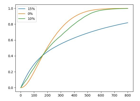 另外,给出一些抽取次数对应的分布情况(即x%的人能在这个抽取次数下抽到至少一张SP般若),及与固定15%up的模型的比较。