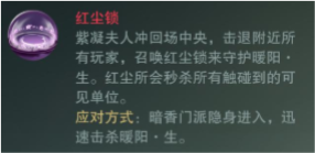 2. 出在场中间的球【红尘锁】,只能暗香隐身进去打(或者武当外围斩杀无极,但因为是暖球有反伤),那个外围紫色的圈,碰上就死。暗香的绝学都留到这个时候交,如果输出不够,用暗器,暗器对球的伤害还是很高的。这个球必须打掉,否则一定时间后爆炸,对全场玩家造成伤害,并为boss 附加暖阳之体效果。(如下图)