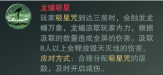 Boss血条下有所中吸星层数与该层对应人数,暗香、少林时刻注意怒所对应的人数开局少林把boss 拉至场边,方便躲技能【游龙索魂】