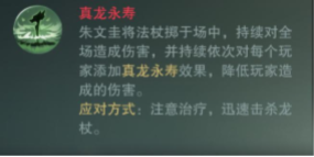 7. 真龙永寿debuff:每层会使造成的伤害降低,无法获得门派技能护盾且使用翻滚和轻功(意思就是不能跳轻功、不能刷绝学、不能开盾、不能取消技能前后摇) ,该状态最多可叠加20层。所以要尽快破这个阶段,不然叠20 层,打杖只掉几千几百血
