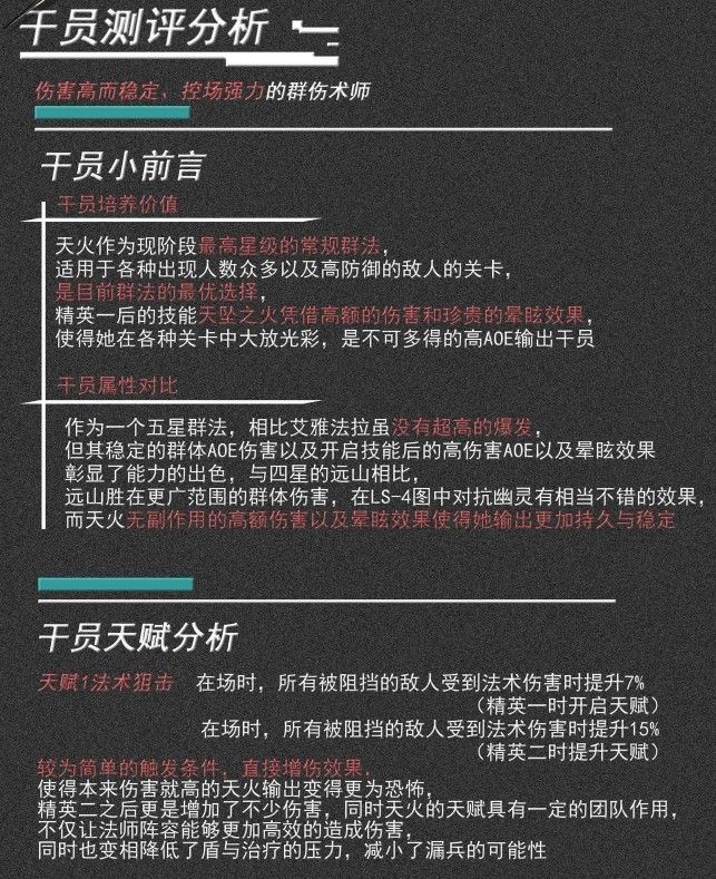 作为一个五星群法,相比艾雅法拉虽没有超高的爆发,但其稳定的群体AOE伤害以及开启技能后的高伤害A0E以及晕眩效果彰显了能力的出色,与四星的远山相比,远山胜在更广范围的群体伤害,在LS-4图中对抗幽灵有相当不错的效果,而天火无副作用的高额伤害以及晕眩效果使得她输出更加持久与稳定。