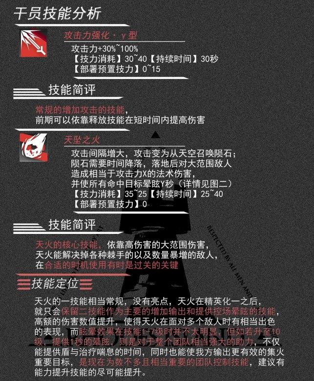 另一方面是范围型伤害只需要施放既可以对一个区域内的敌人造成伤害,在重装干员阻挡多个敌人的时候能够最好的发挥优势,而天火的被动也增加了对阻挡敌人的法术伤害,提高了消灭敌人的效率