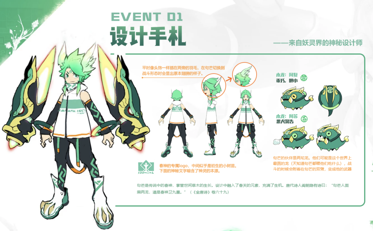 《一起来捉妖》活动“神灵”句芒设计手札,游戏角色源自《山海经》中春神“句芒”形象的活化