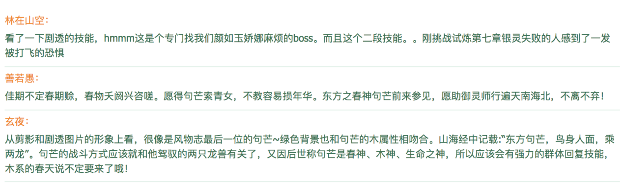 从玩家对新活动“神灵”句芒的评价中不难发现,通过游戏探索、养成、对战等玩法机制以及设置悬念的运营方式,玩家开始对句芒原始形象进行理解与挖掘