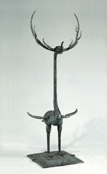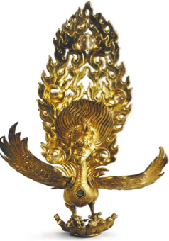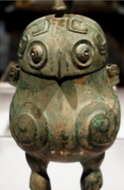 文物从左往右分别是:重庆中国三峡博物馆-虎钮錞于、湖北省博物馆-鹿角立鹤、山东博物馆-亚丑钺、四川广汉三星堆博物馆-铜纵目面具、云南省博物馆-宋大理国银鎏金镶珠金翅鸟