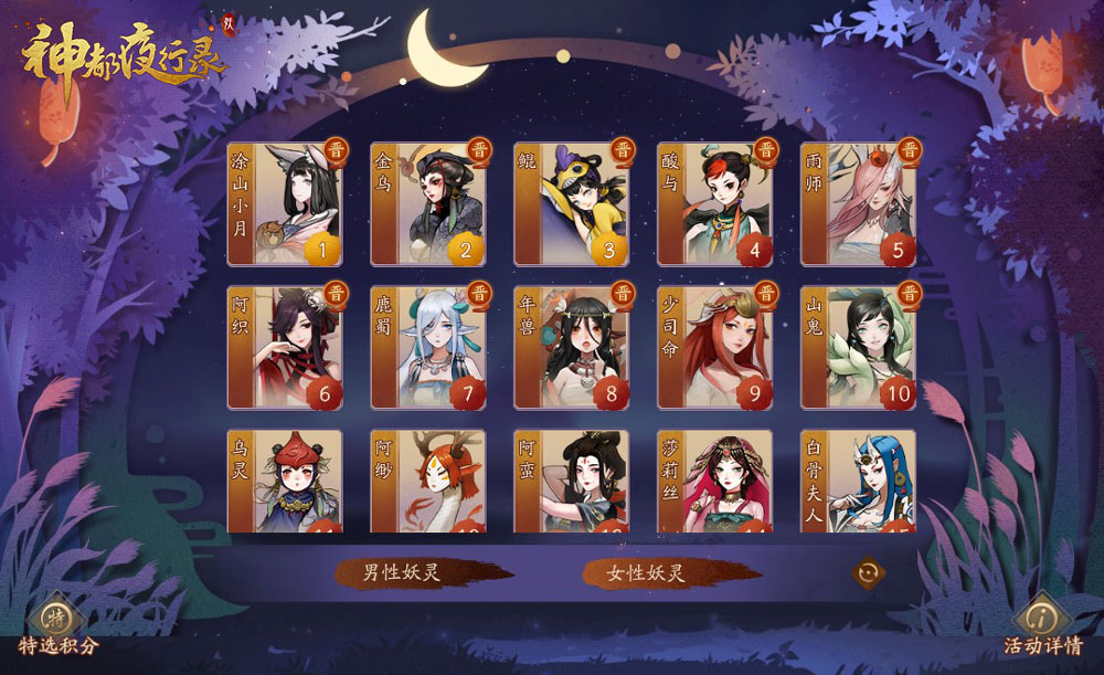 随着5月17日虚拟偶像选拔活动“神都妖灵妖”的正式开启,妖灵投票通道也将开启!整个神都妖灵妖活动分为海选阶段,特选阶段与终选阶段三个阶段,每完成一个阶段都将解锁重磅福利。第一个海选阶段将在2019年5月17日游戏维护后开启,于2019年5月27日0:00截止。活动将选出男女各前十位妖灵进入特选阶段,同时全服发放3张唤灵符和5个青团食盒作为参与奖励。在2019年5月30号维护后至2019年6月13号14:00,特选阶段将正式开启,男女妖灵各选拔5位可以进入下一轮。特选结束后,游戏中将会为选出妖灵开放特选卡池。