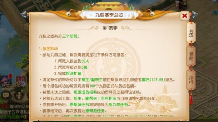 从5月20日~6月3日,玩家所在帮派只要帮派人数达到50、帮派等级达到5级且完成帮派扩建,即可由帮主或副帮主前往九黎使者哪咤处报名。届时,每个报名成功的帮派将拥有100个九黎正式队员名额,获得正式队员资格的玩家将在报名结束后,进入九黎之墟中,与其他63个帮派在同一地图在互相角逐。为帮派的荣誉而战!