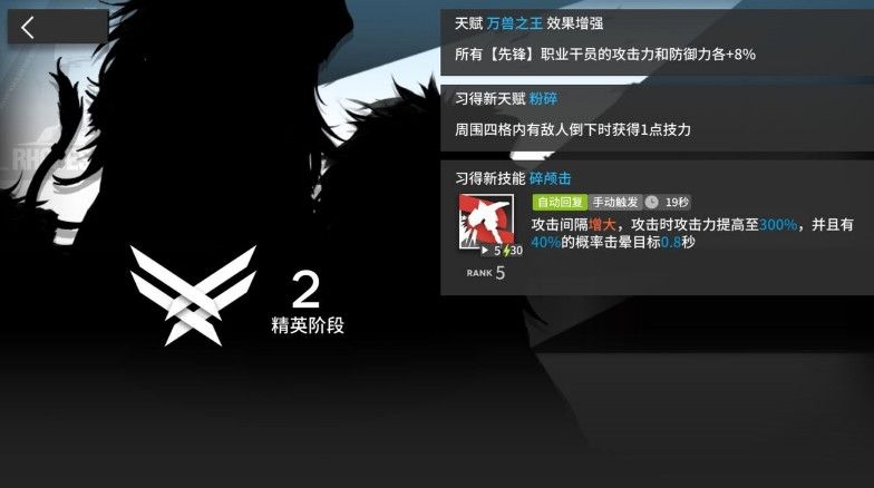 精英二,费用不变,三技能碎颅击。伤害控制技能,攻击力提高,并带有几率击晕敌人,但不增加费用。被动新增粉碎:附近四个有敌人死亡增加1技力。