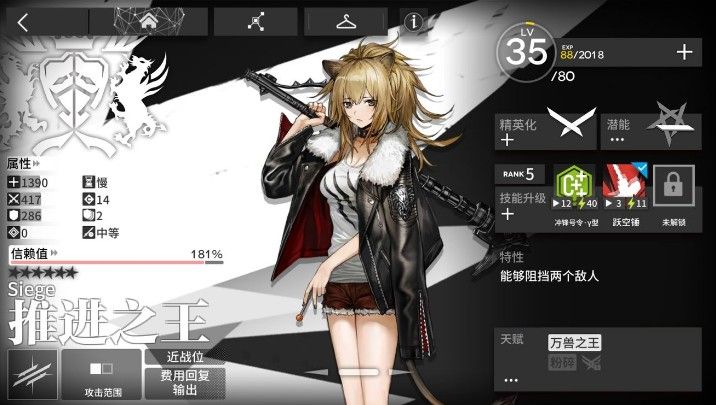 推进之王在没有精一之前有着接近近卫的面板,新人使用的时候不容易翻车(死或漏怪),还能反费用,非常稳定的六星前锋。搭配正常双狙可以顺风顺水达到精英一练度图的要求。