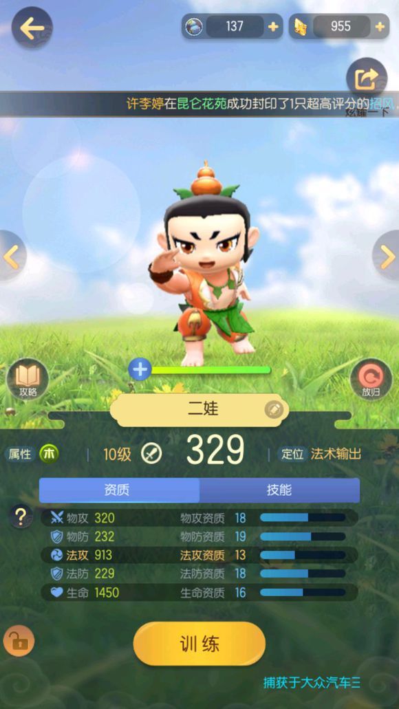 二娃是木属性的,技能就是千里眼和顺风耳了,不用猜都知道,应该是个战斗辅助,因为这两个技能完全没有伤害,也说不定,万一是激光眼呢。