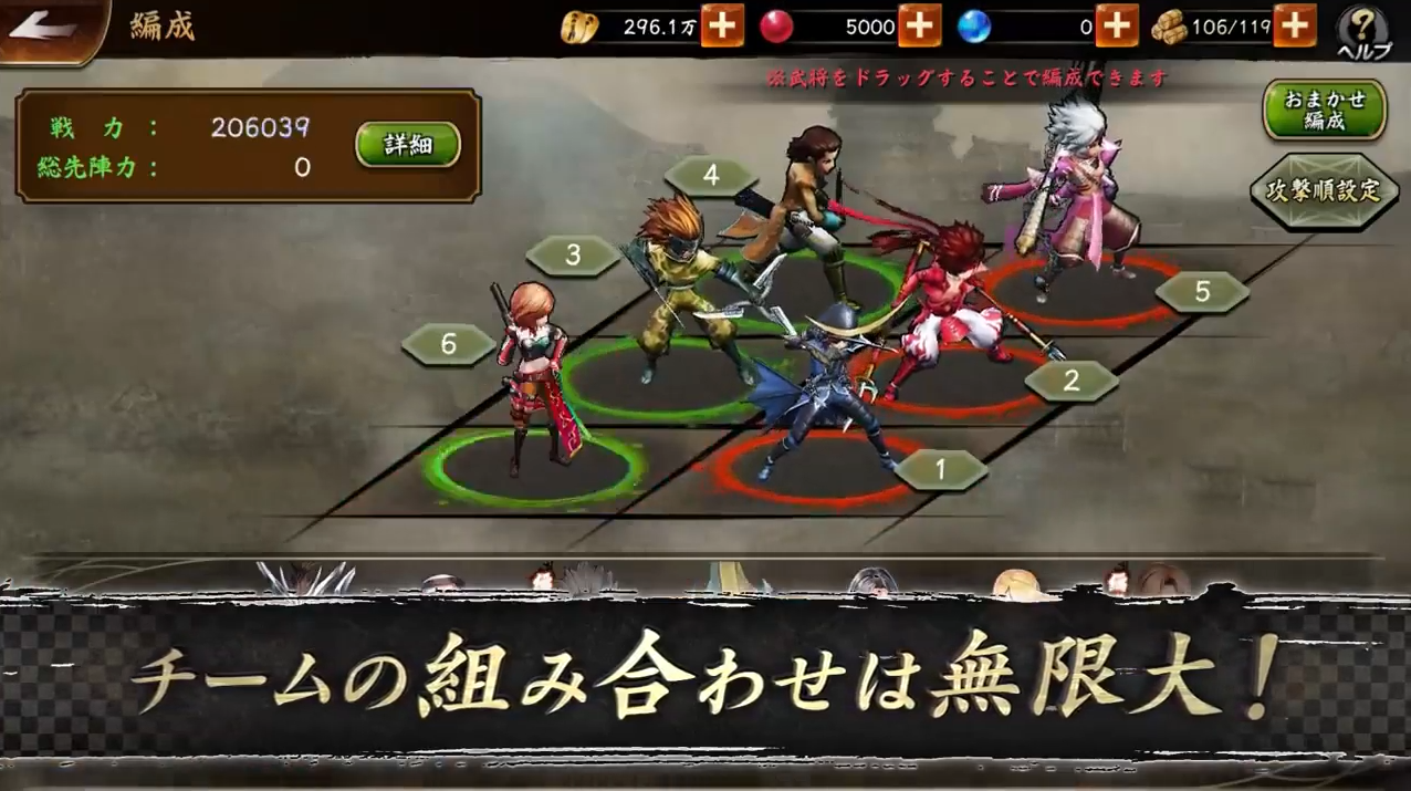 从玩法介绍视频中可以看到,《战国Basara:Battle Party》与传统的手游玩法相似,采用了“抽卡”+养成的核心系统,玩家可以通过材料养成的方式,不断强化抽到武将的品质和等级。战斗中《战国Basara》中熟悉的武将们将化身为Q版可爱形象,通过玩家们的排兵布阵发挥他们最大的作用;可以看到,武将们被分为了“攻”“技”“防”三种不同的属性,通过在六芒星阵中摆放不同的位置,可以产生出独特的增益效果。