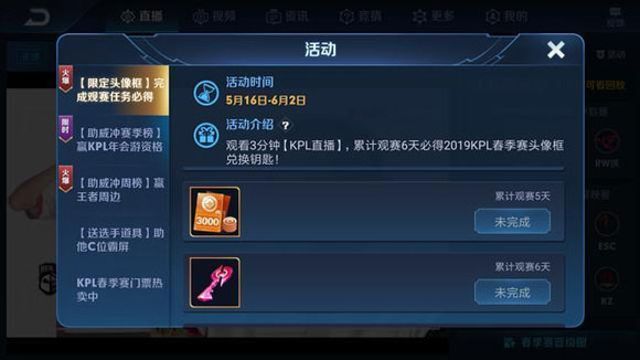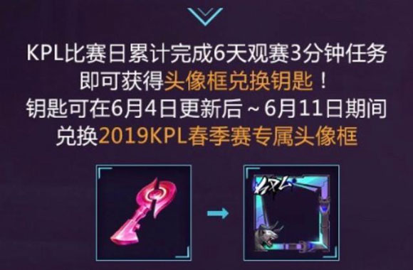 此外,在赛事中已经开启了本届KPL头像框的兑换活动,只要在5月16日~6月2日之间累计观赛6天,每次观赛3分钟即可,就能获得兑换钥匙,在6月4日即可兑换全新KPL头像框。